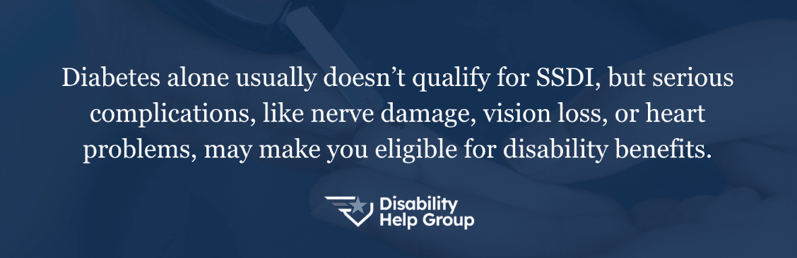 The answer to this question is a bit complicated. Diabetes itself is not a listed condition and its direct symptoms are not sufficient to render a person disabled for SSDI purposes. However, untreated or poorly controlled diabetes can cause a wide variety of other medical conditions, some of which are quite serious.